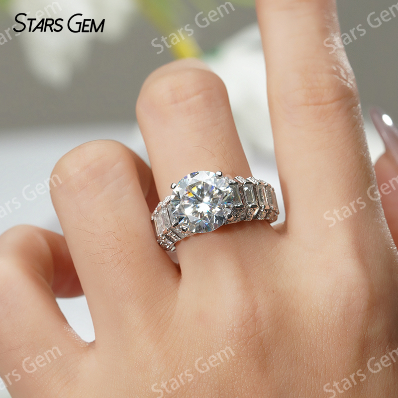 This engagement ring features an 11mm round brilliant cut moissanite as the centerpiece. It's complemented by 2×4mm baguette step cut moissanite and round brilliant cut moissanite side stones, all set in S925 sterling silver. The round brilliant cut maximizes light reflection for a dazzling sparkle. The baguette step cut adds a sleek, geometric contrast, while the round brilliant cut side stones enhance the overall brilliance with the pave setting.