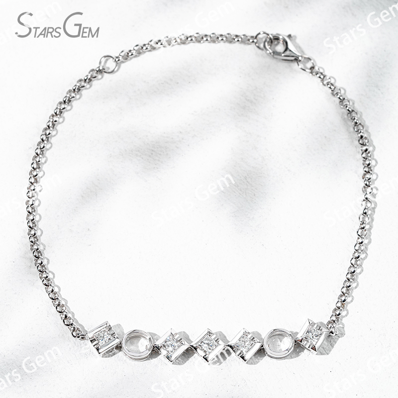 This bracelet features 2.5×2.5mm princess cut lab grown diamonds, set in 18K white gold. The princess cut gives the diamonds a square shape with brilliant facets, maximizing light reflection for exceptional sparkle. The 18K white gold, with a high polish finish, has a smooth, shiny surface that complements the diamonds’ brilliance.