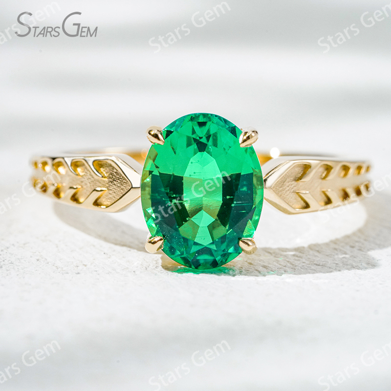 Center Stones:A 7×9mm oval cut lab grown gemstone with VS clarity, delivering excellent sparkle. Available in colors like green (emerald like) or red (ruby like).